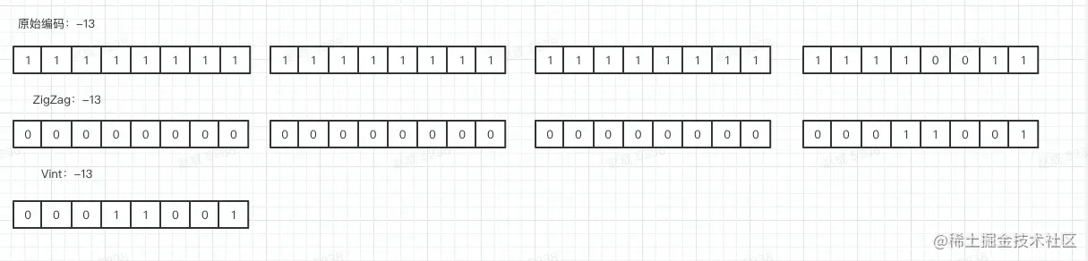 用每个byte的最高位来标识当前编码字节数是否截止,为0则说明编码结束,为1则说明还有后续的byte,最后一个字节的如果不够则可以使用0来补充。比如下面下面对-13先进行zigZag编码然后采用varint,在数值接近于0的情况下产生的byte空间非常小。