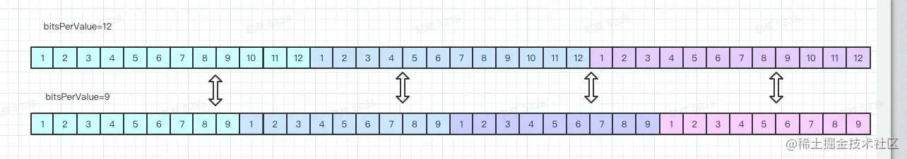 比如下面的例子,底层均是byte数组的情况下,我们如果我们用bitsPerValue=12来标识,则每2个value则字节是对齐的,如果是bitsPerValue=9则需要8个字节才能对齐。