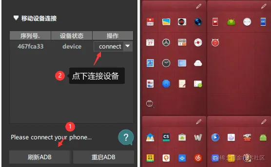 刷新ADB,看到设备后点下connect,右侧设备窗口出现手机界面,说明连接成功。