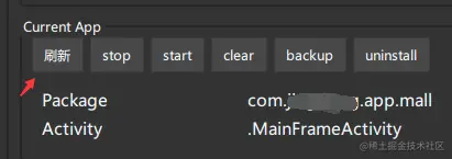 参数传递的应用包名,所以得先拿到包名,IDE支持直接获取,点击设备窗: