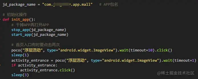 然后就调下poco的API了,等待结点出现,然后点击,初始化部分的大概代码就是这样:
