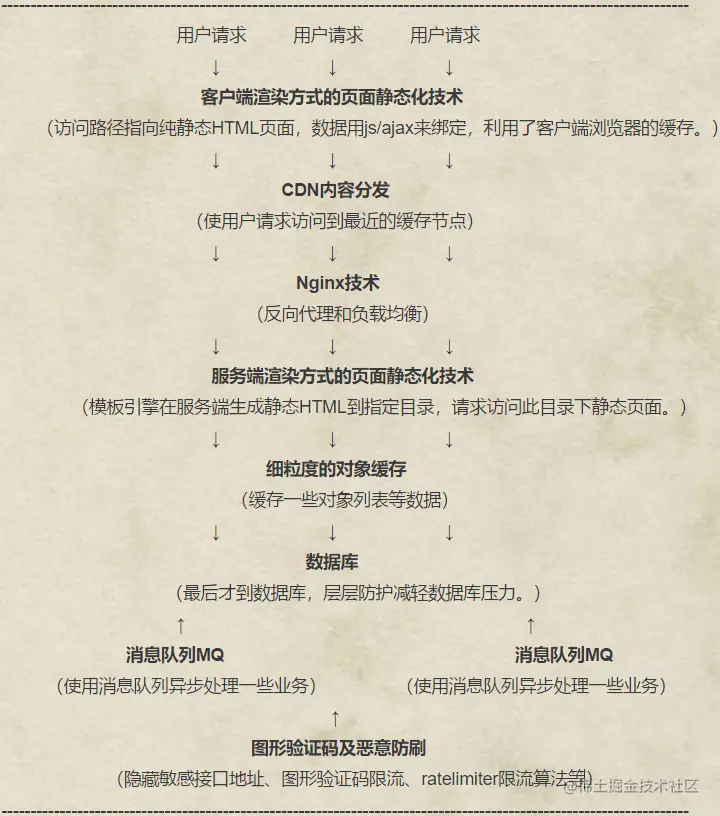 首先,要明确一点,高并发场景下系统的瓶颈出现在哪里,其实主要就是数据库,那么就要想办法为数据库做层层防护,减轻数据库的压力。