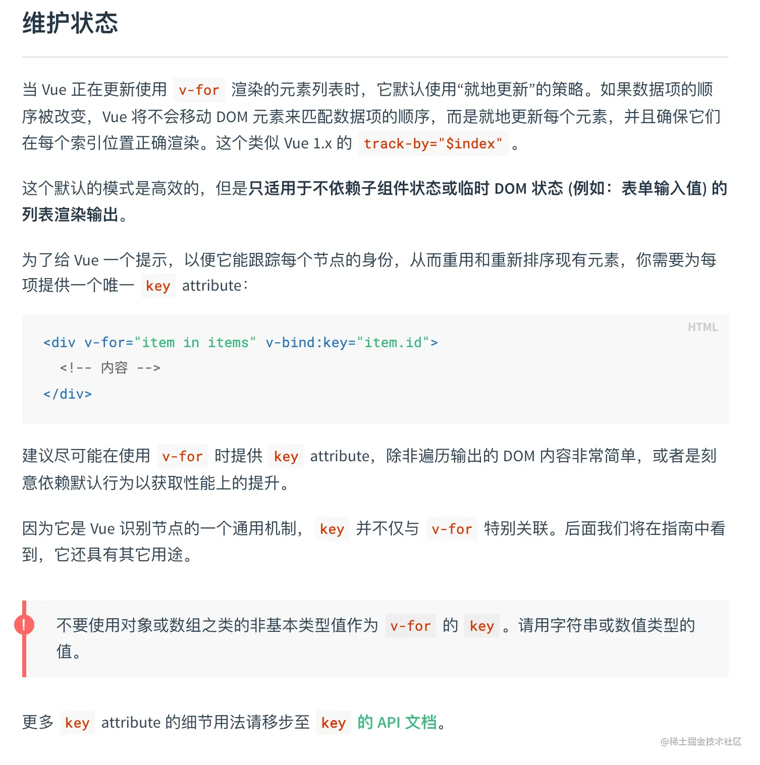 这个默认的模式(就地复用)是高效的,但是只适用于不依赖子组件状态或临时 DOM 状态 (例如:表单输入值) 的列表渲染输出。