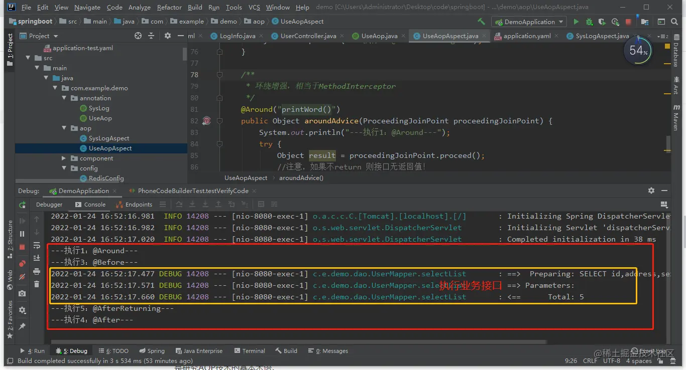 如上结果,你们看到了什么,切面类中的通知(advice)已经都被执行且输出打印,要注意的是,假如全部都通知,可以看到是有先后通知顺序的,但一般这五种通知类型不会同时都放在一起使用的,常见的玩法在项目中就是使用@AfterReturning的 比较多,比如记录接口日志的具体调用情况(比如:获取调用人账户、调用时接口参数、调用者ip、调用时间、调用返回数据、调用操作类型等),就是在目标方法成功执行后调用通知进行获取,这操作一般比较多。还有就是权限校验,那就是在调用目标方法前进行切入,然后获取调用者账户信息再进行权限校验判断该用户是否有权限进行接口访问等。