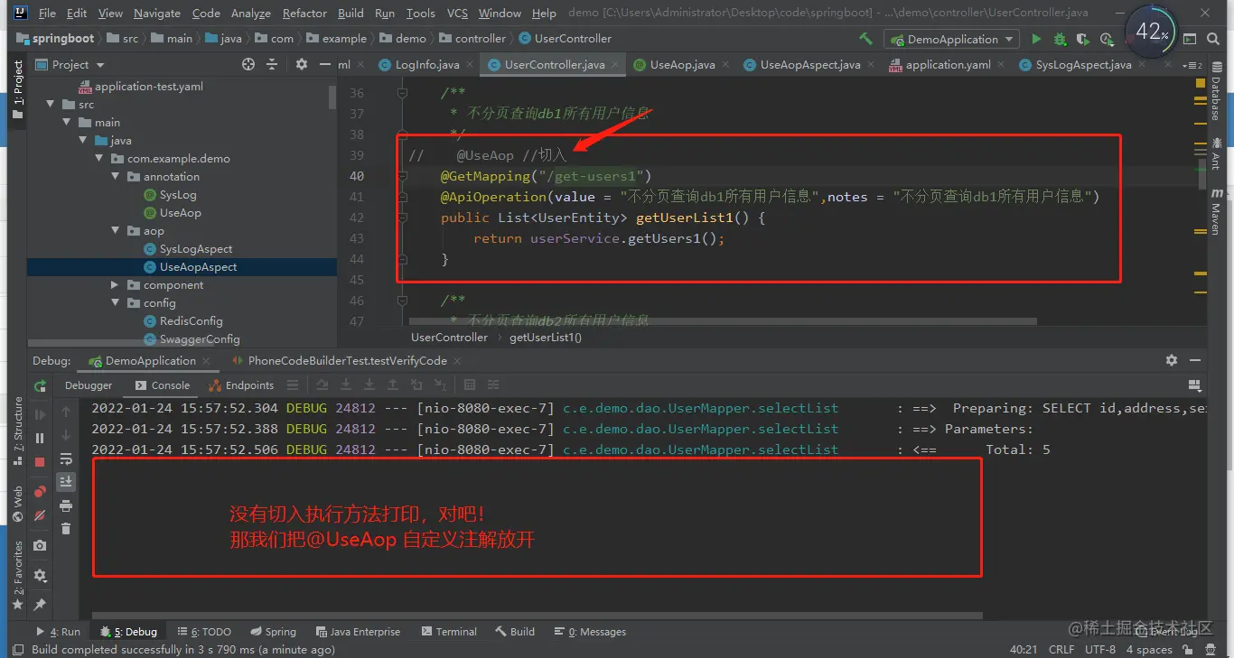 你们可以看到,我直接在我定义的getUserList() 方法上加了我们刚才自定义的注解@UseAop,对吧。你们也记得把它,然后在加上自定义注解与不加上自定义注解,二者进行一下对比,看看是否会成功执行到切面的方法进行输出打印?让我们期待一下