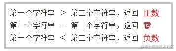 📚 说明:用于比较两个字符串并根据比较结果返回整数, 两个字符串自左向右逐个字符相比,按照 ASCII值 大小相比较,从第一对字符开始比,如果相等则比下一对,直到出现不同的字符或遇 \0 才停止。对比规则如下: