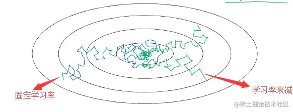 可以由上图看出,固定学习率时,当到达收敛状态时,会在最优值附近一个较大的区域内摆动;而当随着迭代轮次的增加而减小学习率,会使得在收敛时,在最优值附近一个更小的区域内摆动。(之所以曲线震荡朝向最优值收敛,是因为在每一个mini-batch中都存在噪音)。因此,选择一个合适的学习率,对于模型的训练将至关重要。下面来了解一些学习率调整的方法。