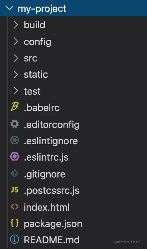很快就可以看到已经成功初始化了my-project,此时可以看一下my-project文件夹下面