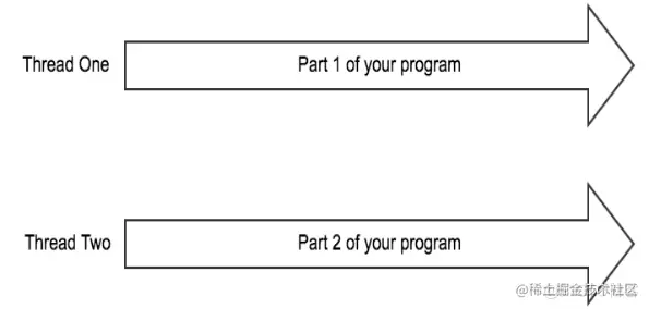 线程是操作系统为您提供的一项功能,可让您并行运行程序的各个部分。 假设您的程序由两个主要部分组成,第 1 部分和第 2 部分,并且您编写的代码使得第 1 部分在 线程一 上运行,而第 2 部分在 线程二 上运行。 在这种情况下,程序的两个部分将同时并行运行; 下图说明了它的外观: