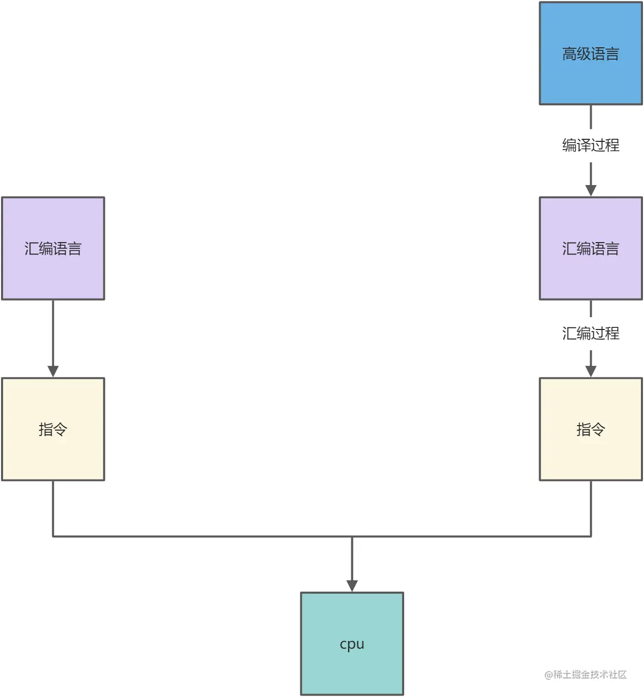 在汇编语言的基础上,又开发出了高级语言,更接近人的语言,如java python等语言 高级语言想要在平台执行也是要转为指令才能在cpu执行的