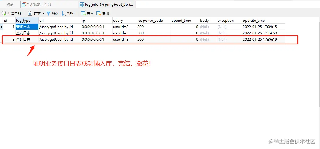 接口是调用成功了也无报错,可aop切入日志是否插入成功呢?咱们可以打开数据库查看log_info表,日志业务接口是否成功被记录?若成功,肯定会新生成一条记录的。