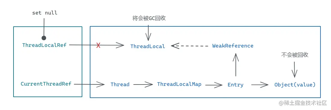 内存溢出是使用 ThreadLocal 需要注意的一个问题,但使用 ThreadLocal 时发生内存泄露的不是 ThreadLocal 对象,而是存储在 Entry 中对应的 value。