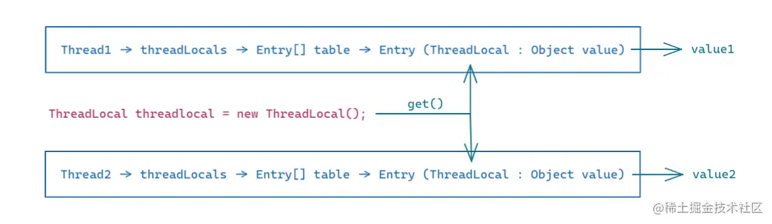 到这里可以整理出一个关系链,Thread 中有一个 ThreadLocalMap 成员 threadLocals,它存储各个 ThreadLocal 对应的值,由于不同的线程的 threadLocals 不同,因此相同的 ThreadLocal 在不同线程中获取到的值是不同的,这就是 ThreadLocal 中的值线程独享的原理。