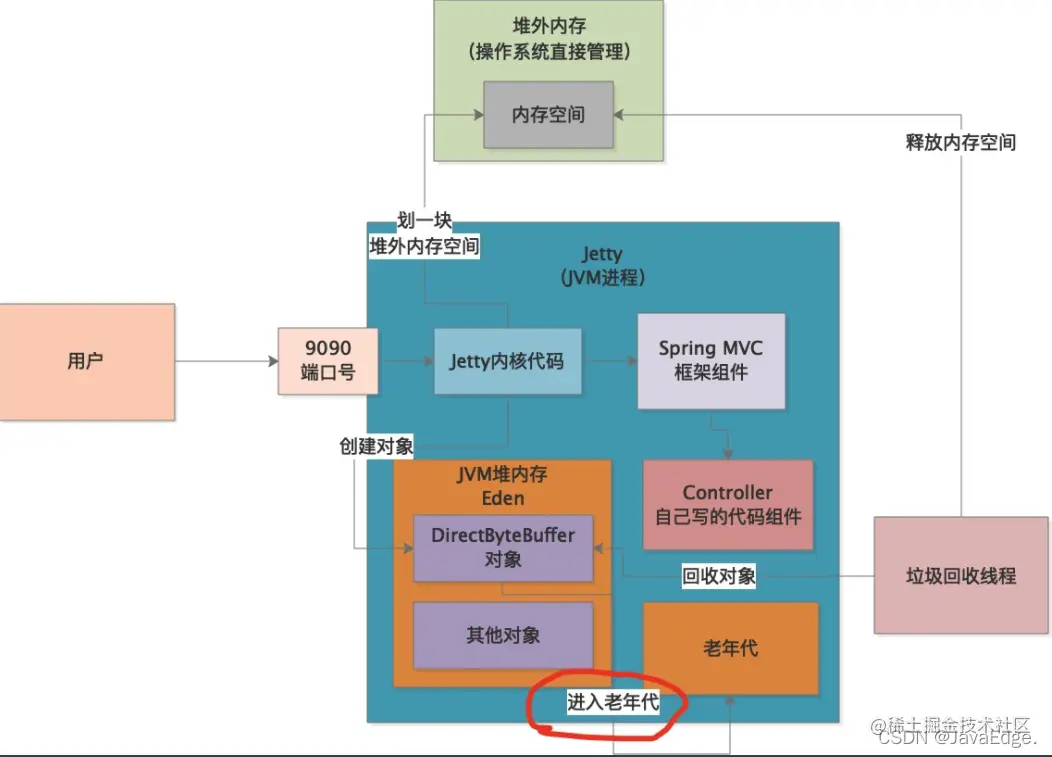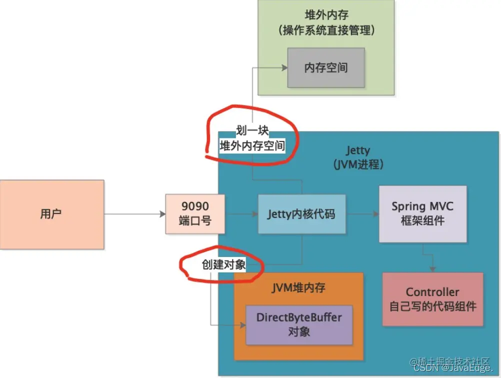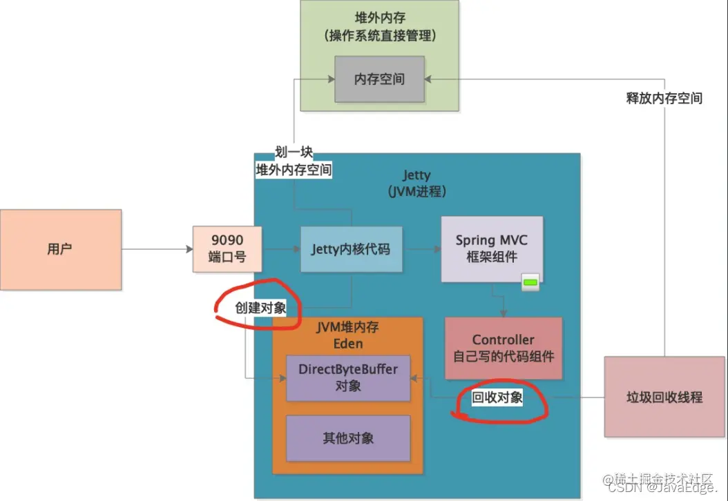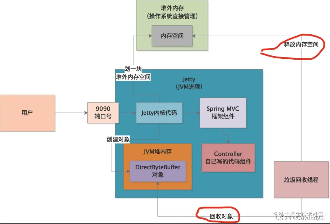 Jetty既然是用Java写的,那他是如何通过Java代码申请堆外内存的?然后这个堆外内存空间又如何释放呢?这涉及Java的NIO底层。
