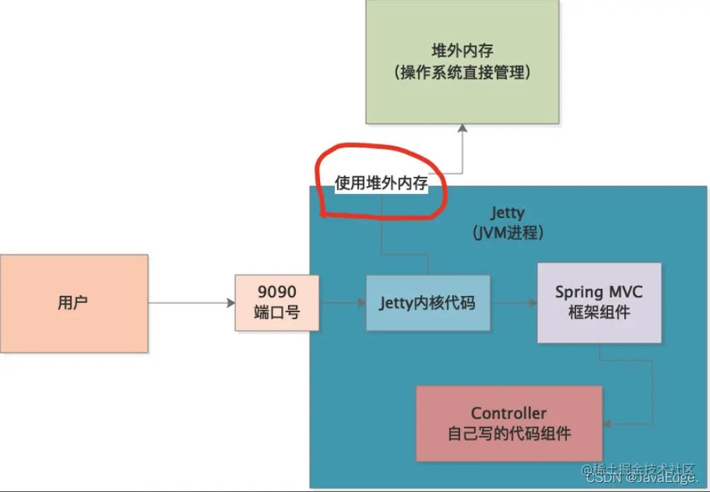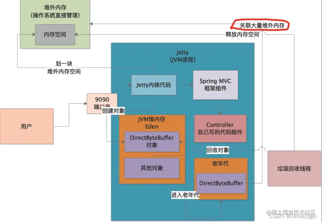 堆外内存,JVM堆内存之外的一块内存,不是由JVM管理,但Java代码却能在JVM堆外使用一些内存空间。这些空间就是Direct buffer memory,即直接内存,这块内存由os直接管理。但称其为直接内存有些奇怪,我没更爱称其为“堆外内存”。