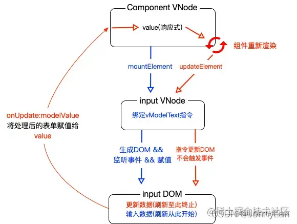 input输入数据 -> 数据处理 -> 调用onUpdate:modelValue对应的$event => (inputValue = $event)方法 -> 响应式数据变化组件更新 -> input设置更新input.value = newValue更新至此停止。