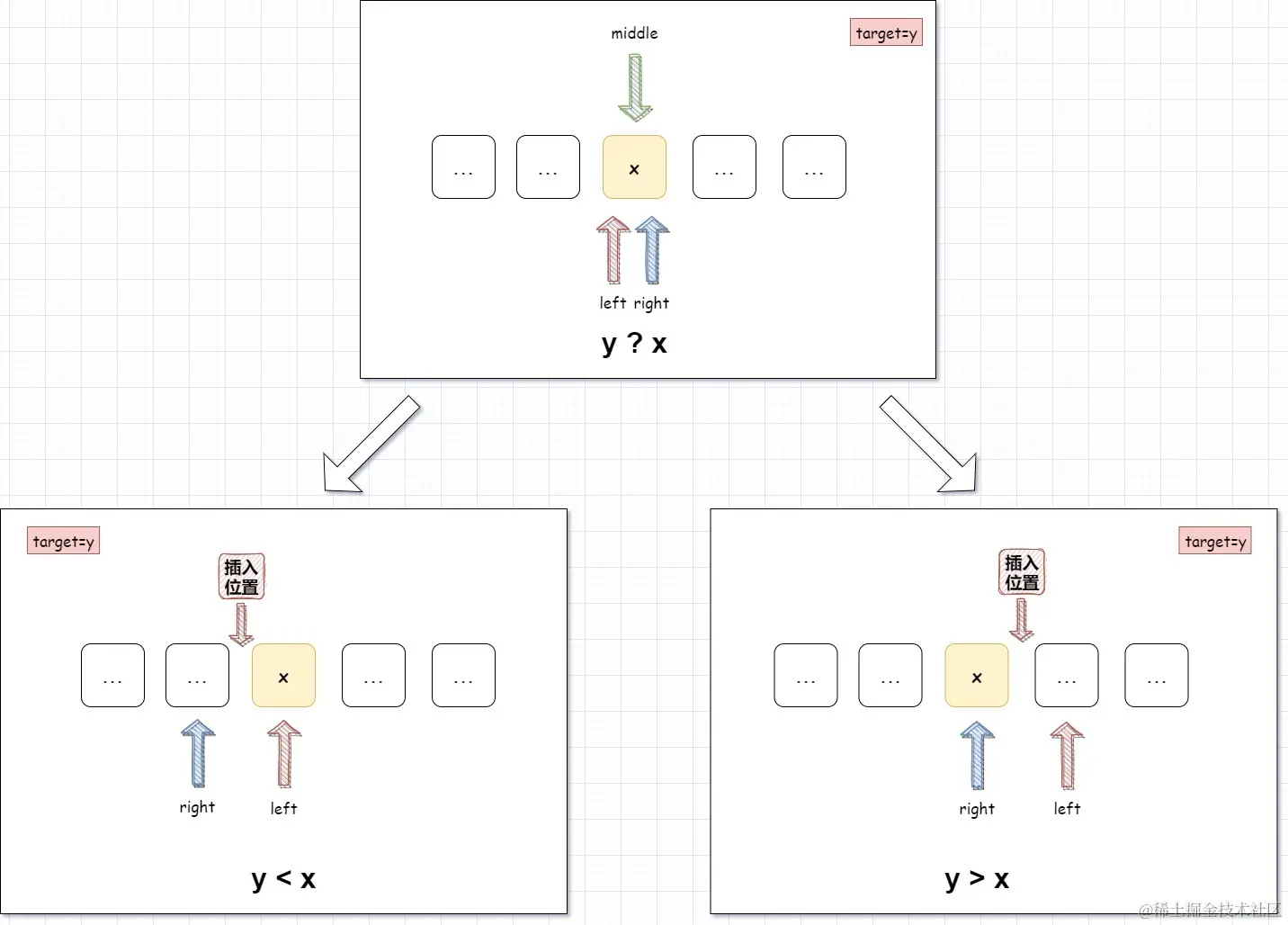 然后接下来就是判断语句,判断 target(图中 y) 与 nums[middle](图中 x) 的关系,分为两种情况: