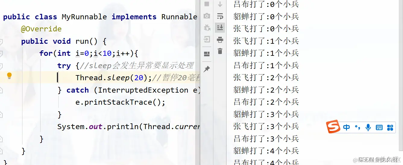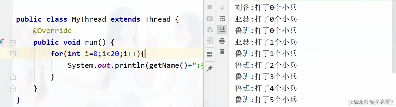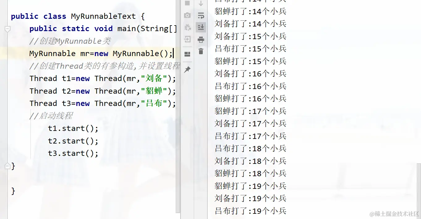 System.out.println(Thread.currentThread().getName()+"打了:"+i+"个小兵");