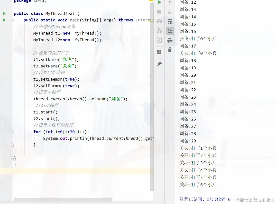 ♠将张飞关羽设置为守护线程,刘备设置为主线程, 则当所有的主线程结束后,守护线程也会跟着