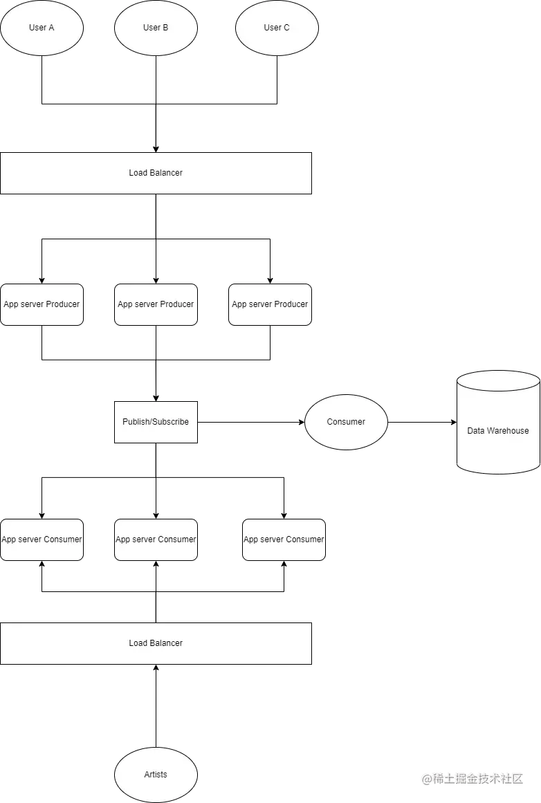 - 当用户点击播放时,系统会处理请求,数据将被更新到艺术家服务器。用户听这首歌的次数将被存储在Artist’s-User数据库中,也可以在系统中添加缓存