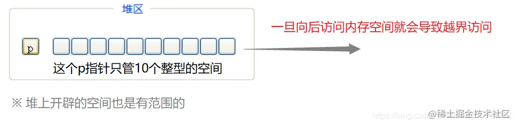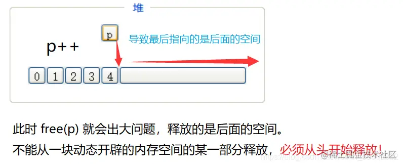📌 注意事项:这么写代码会导致 p 只释放了后面的空间。没人记得这块空间的起始位置,再也没有人找得到它了,这是很件很可怕的事情,会存在内存泄露的风险。