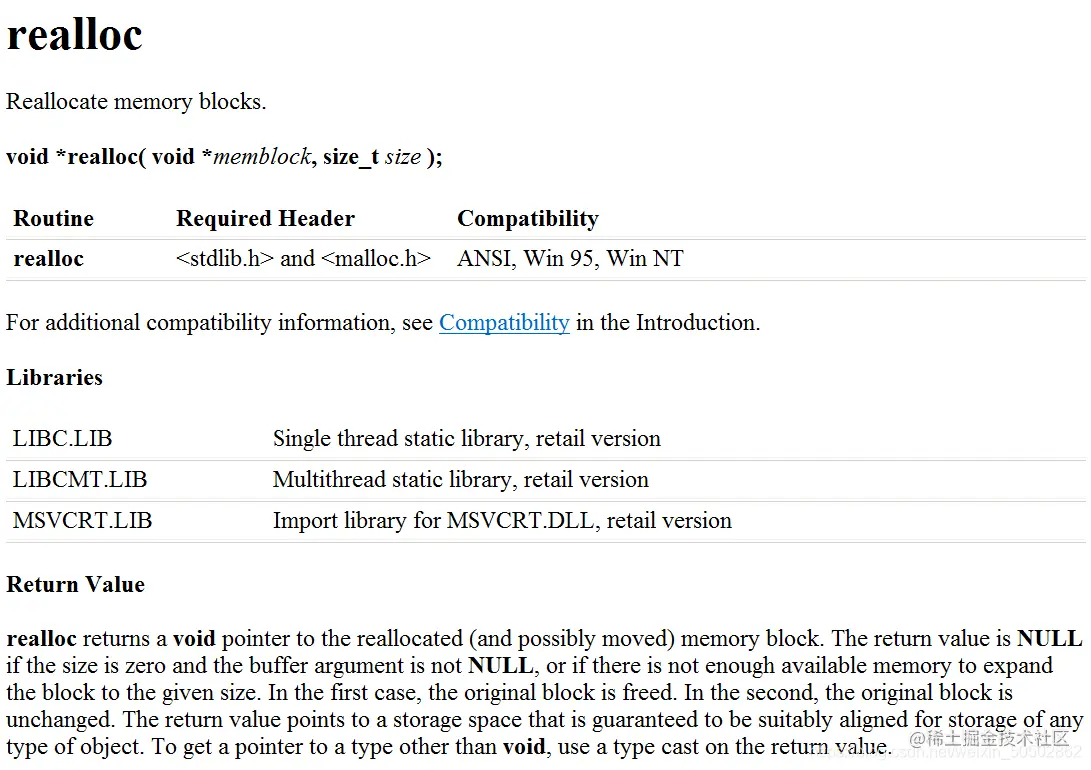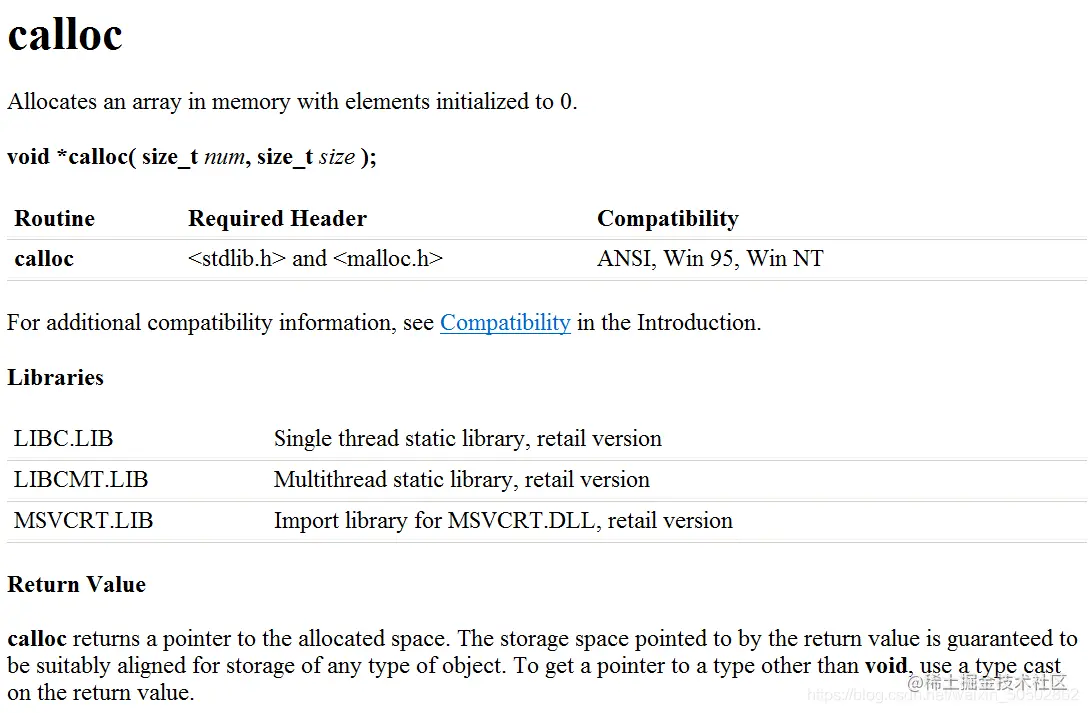 ② 与函数 malloc 的区别在于 calloc 会在返回地址前把申请的空间的每个字节初始化为 0 。