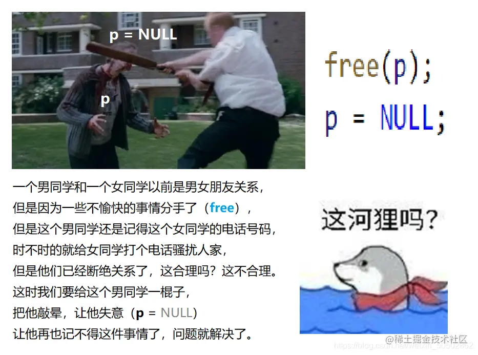 🔑 解析:因为 free 之后那块开辟的内存空间已经不在了,它的功能只是把开辟的空间回收掉,但是 p 仍然还指向那块内存空间的起始位置,这合理吗?这不合理。所以我们需要使用 p = NULL 把他置成空指针。为了加深印象,举一个形象的例子: