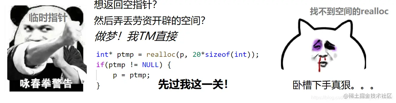 ❗ 刚才提到的第三种情况,如果 realloc 找不到合适的空间,就会返回空指针。我们想让它增容,他却存在返回空指针的危险,这怎么行?