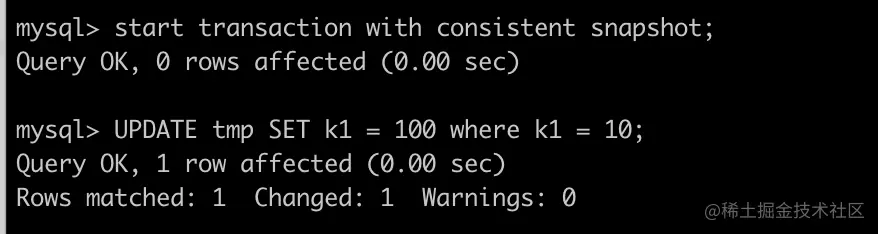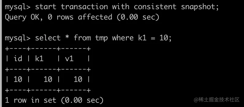 可以看到在事务一执行查询时 select * from tmp where k1 =1 时,尽管事务二已经将k1值更新为11,但是此时仍然可以查到结果。而使用写-读查询查到的结果则为空。