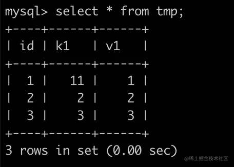 update tmp set k1 = 11 where k1 = 1; | |