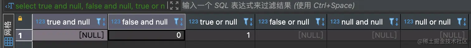 由于存在null(不确定值),因此真值表为三值逻辑