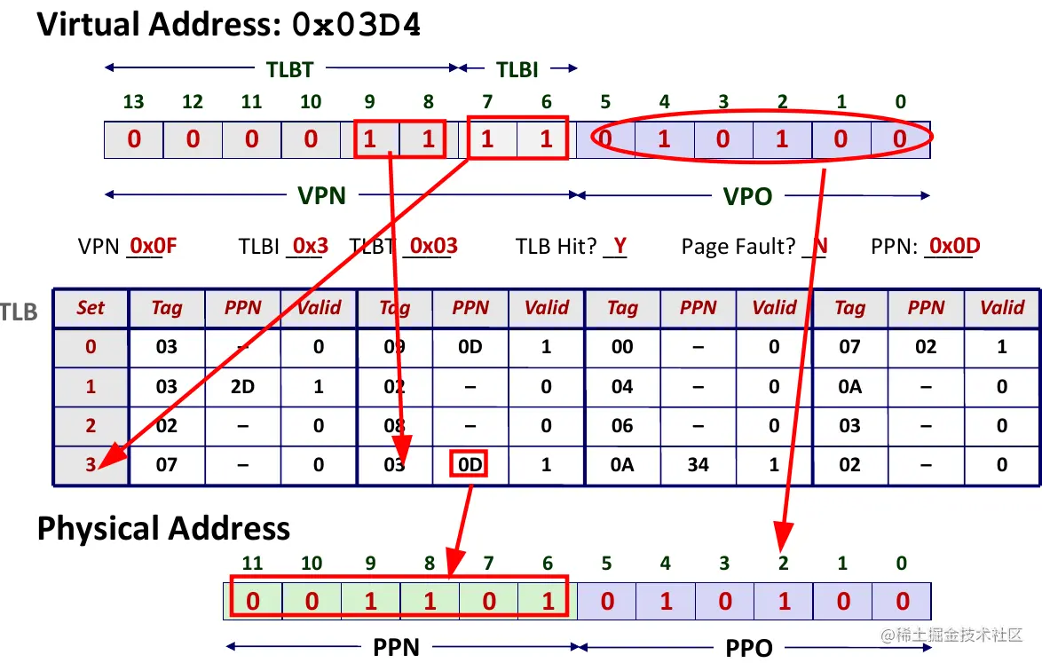 TLBI:TLB索引TLBT:TLB标记(tag)VPO:虚拟页偏移量VPN:虚拟页号
