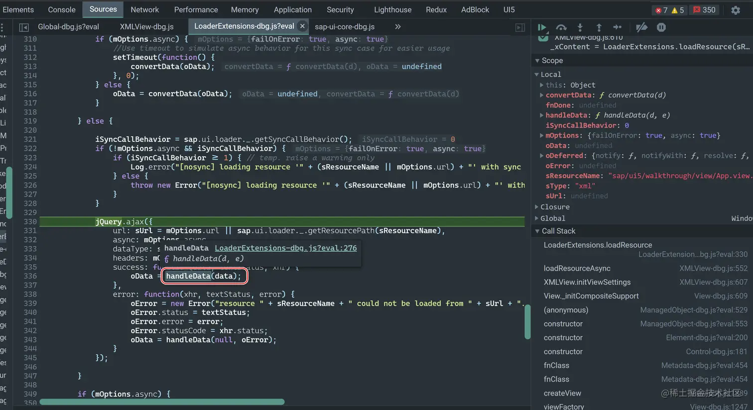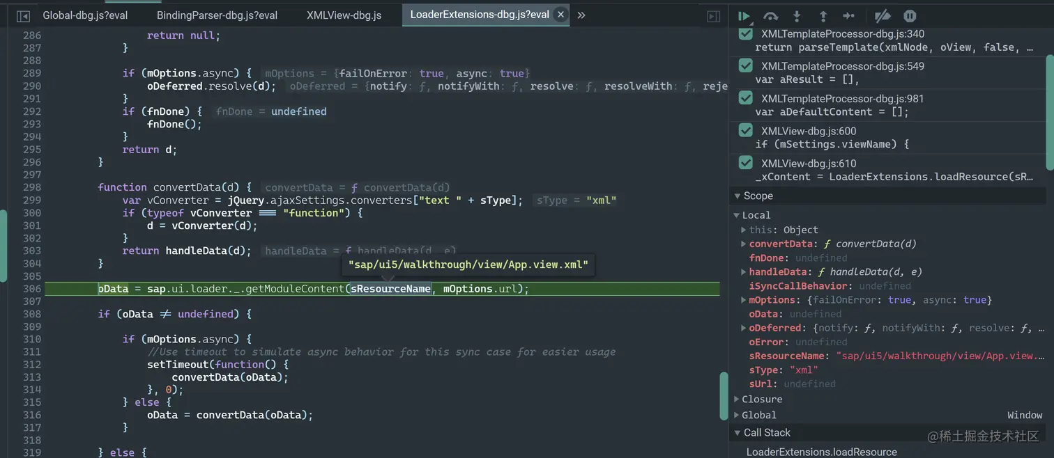 LoaderExtensions.loadResource 执行异步加载 xml 视图文件的任务,加载成功的结果,通过输入参数 oData 传递到匿名回调函数内。