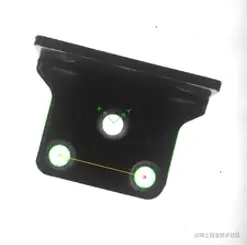 测量:测量两圆圆心之间的距离,在定位到工件后,就可以使用 CogFindCircleTool 算子缩小并固定检索区域先把圆找到,再用 CogDistanceCircleCircleTool 算子来连接测量两个圆,效果如下: