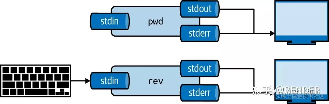Linux系统有许多命令行工具,这些工具可以完成非常强大的功能。如grep命令可以用来在文本中搜索特定的字符串,wc可以计算文本的行数,sort可以对文本进行排序等。命令行工具运行的时候是一个进程,每个进程都有三个标准的输入输出流,分别是标准输入*stdin, 标准输出stdout, 以及错误输出stderr*。当在终端中运行rev命令时,rev将接收用户在键盘上输入的字符串,进行反序后输出到屏幕,其原理如下图所示。