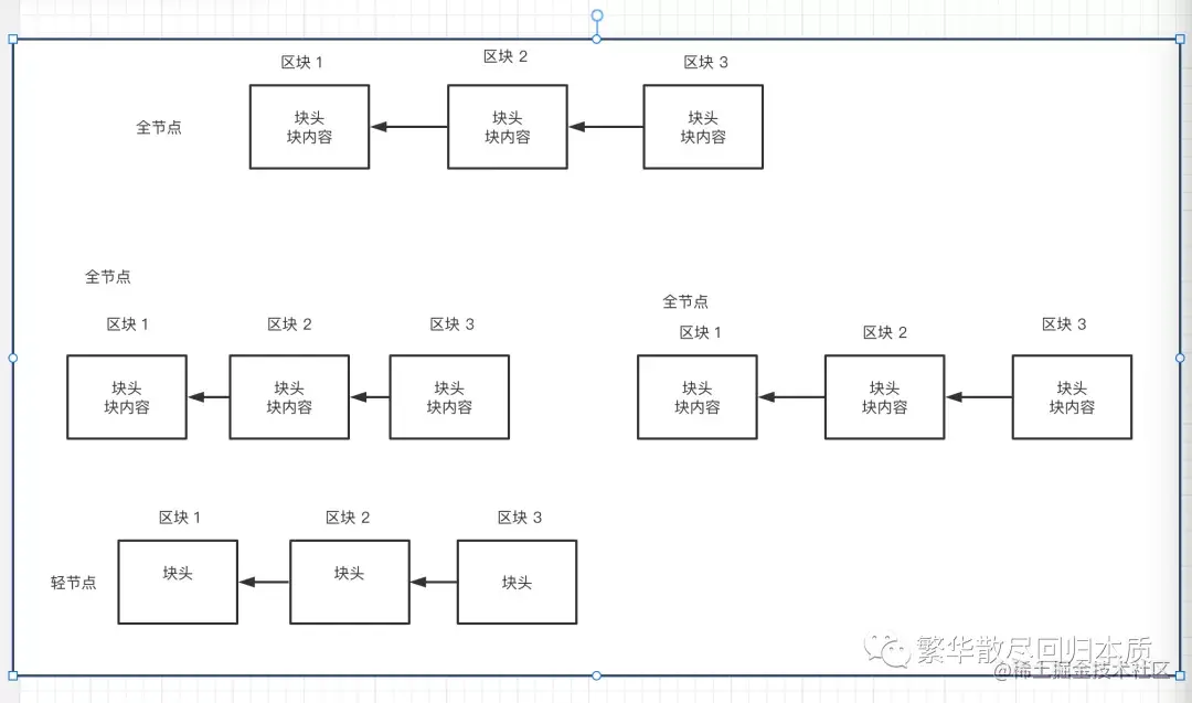 全节点存储着完整的区块链,每次数据的变更,需要通过共识机制,广播给所有全节点。轻节点存储着区块链中的block header部分(也是区块组成的链,只不过每个区块只包含block header)。
