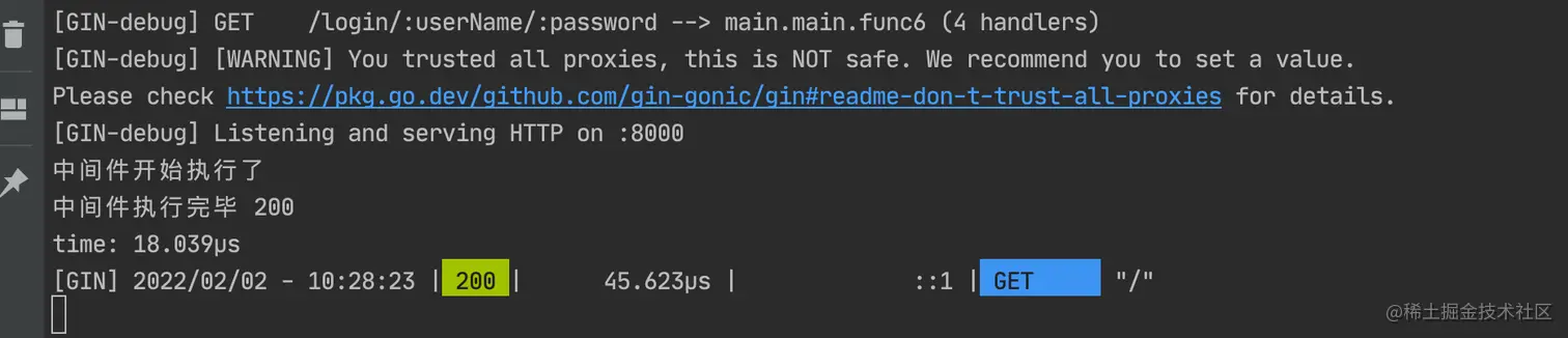 fmt.Println("中间件执行完毕", status) t2 := time.Since(t)