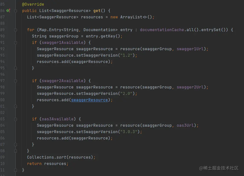 换一种思路,其实还有另外一种方法,重新实现SwaggerResourcesProvider接口,并将实现类使用@Primary注解修饰,覆盖默认的InMemorySwaggerResourcesProvider实现类,重写get()方法即可。