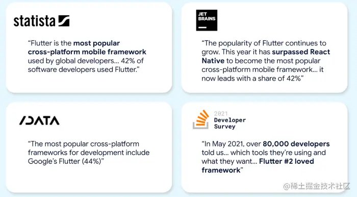 Statista和SlashData等分析师衡量,2021 年 Flutter 已经成为最受欢迎的跨平台 UI 工具包: