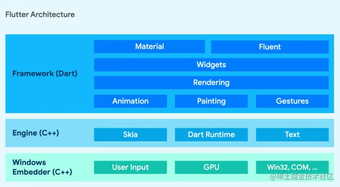 正如我们对 Android 和 iOS 的支持一样,Flutter 的 Windows 实现结合了 Dart 框架和 C++ 引擎,Windows 和 Flutter 通过一个嵌入层进行通信,该嵌入层承载 Flutter 引擎并负责翻译和分发 Windows 消息。
