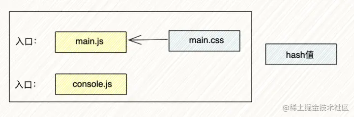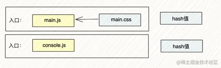 main.js、main.css一个阵营,都属于main.js入口文件console.js一个阵营,属于console.js入口文件
