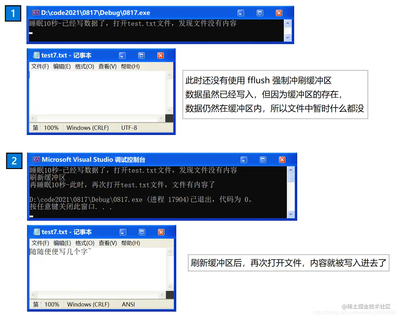 printf("睡眠10秒-已经写数据了,打开test.txt文件,发现文件没有内容\n");