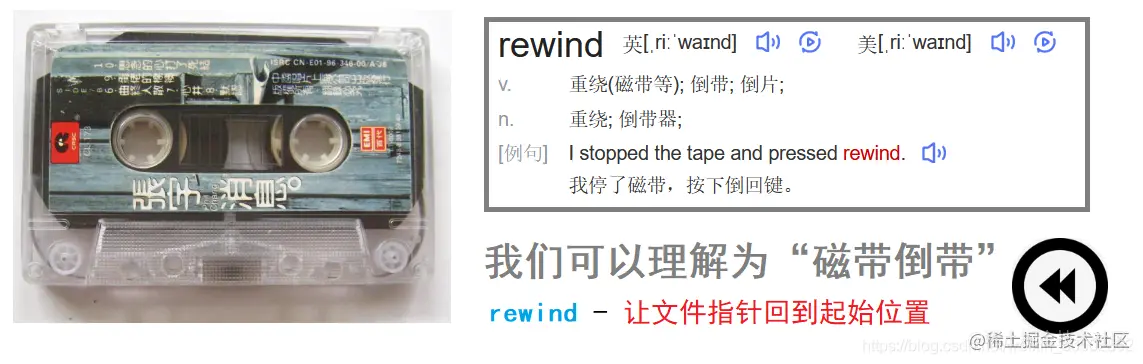 📚 介绍:rewind(意为倒带,磁带倒带),设置文件位置为给定流 stream 的文件的开头,让文件指针回到起始位置。