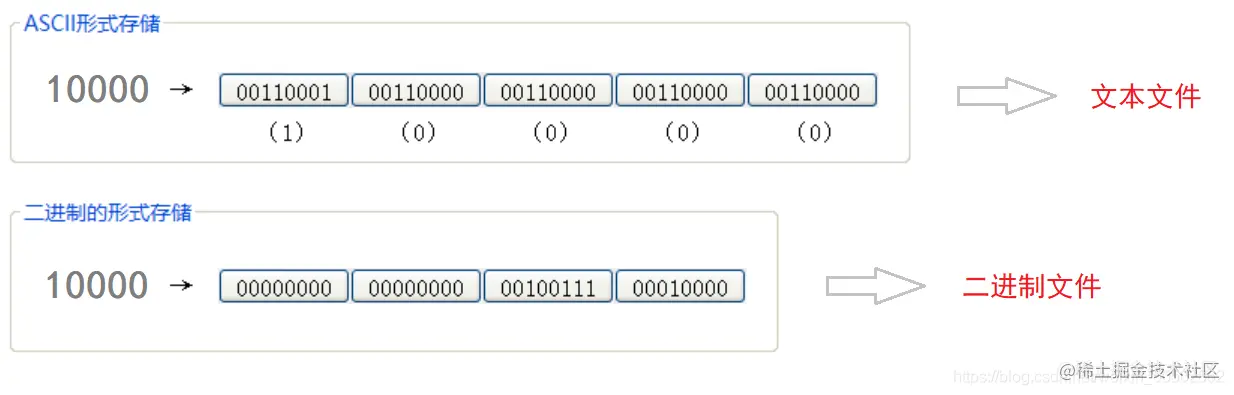 🌰 举个简单的例子:比如整数10000,如果以 ASCII 码的形式形式输出到磁盘,则磁盘中占用5个字节(每个字符占1个字节)。而如果以二进制的形式输出,则在磁盘上只占4个字节。