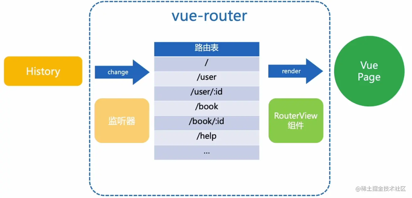 1.总的说来,Vue-Router通过监听浏览器History对象的变化,再根据路由表中配置的路由对应关系,通过RouterView组件渲染到VuePage上,从而实现不刷新页面并跳转。