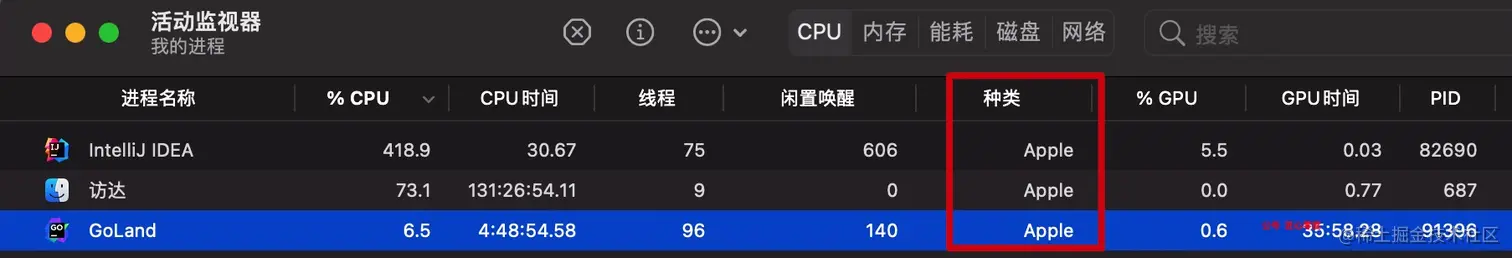 我们可以通过活动监视器进行查看,如果是 M1 芯片,那么种类显示的就是 Apple,如果不是 Apple 那么下载安装包选择的不对,那就会导致非常卡顿的;