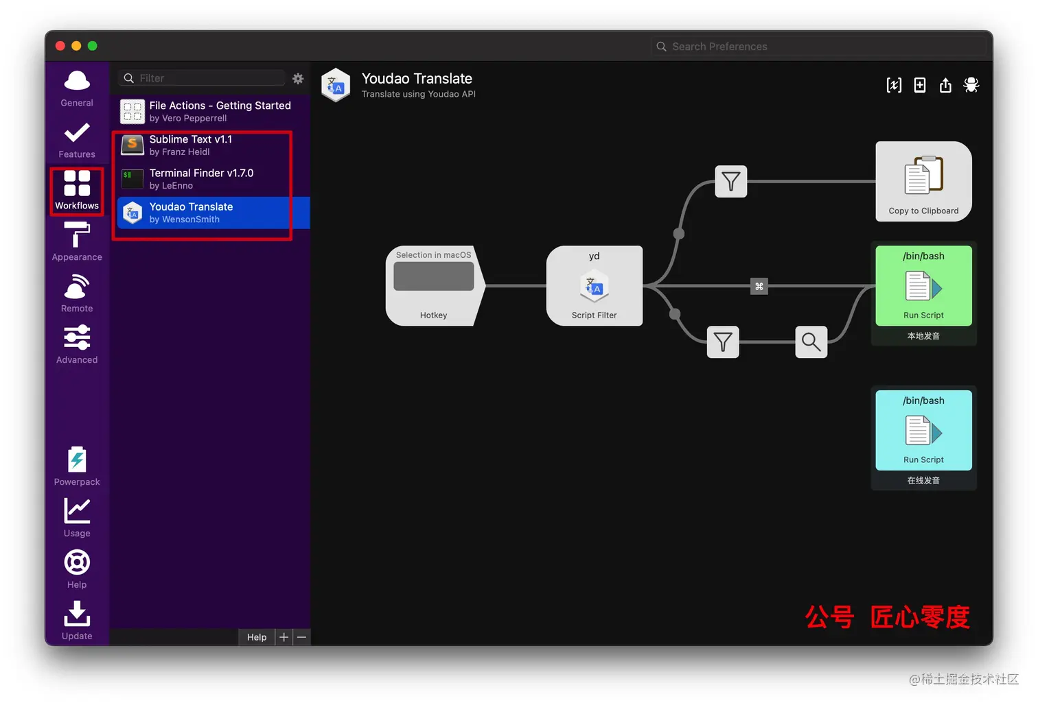 Alfred 可以快速执行启动应用、计算公式、搜索一切之外,还有强大的 Workflow 网上有很多 Workflow 插件,比如我最常使用的 youdao 翻译: