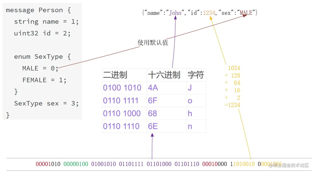 字符串类型将每个字符转化为ASCII码,实际上不会节省空间。枚举类型相比于原先JSON的**“MALE”** 值则精简了许多,直接由二进制的 1 代替,仅占据 1 bit。对于数字 1234 的类型是 Varint。它是一种紧凑的数字表示方法,用一个或多个字节来表示1个数字,数字越小,则使用的字节越少。图中的 1234 由 1024+128+64+16+2 构成,表示为 00010011010010。具体的算法细节可参考