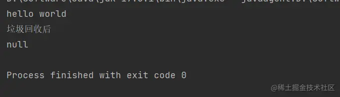 // 创建一个软引用 hello_world 关联了一个强引用对象String,当然这个对象创建完就不可达了,会被回收掉,