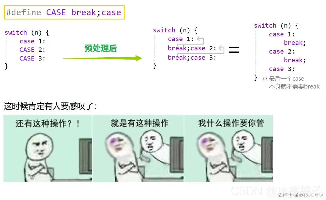 ③ 这里假设一个程序里 switch 语句后面都需要加上break,但是某人原来不是写C语言的,他以前用的语言 case 后面是不需要加 break 的,因为他不适应每个 case 后面都要加上 break,所以总是会忘。这时可以妙用 #define 来解决: